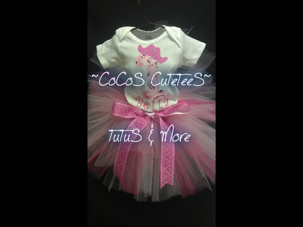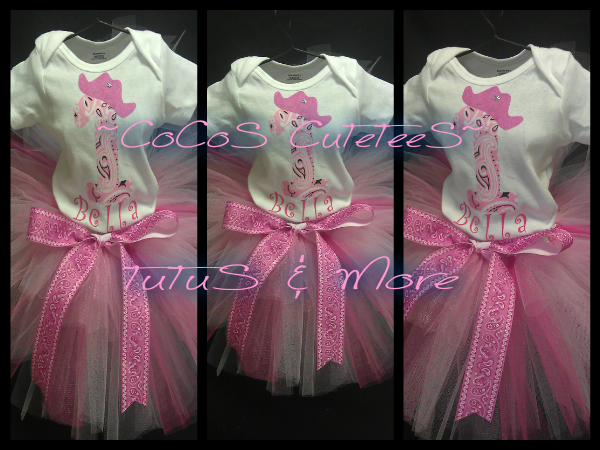 We ♥ cowgirls!! Pink bandana print "1" or "2" with cowgirl hat w/ star in center & name...3-color pink tutu w/ bandana bow in front! Pair with pink cowgirl boot leggings we have in leggings album. Add matching hairbow also. This can be customized as little or much as you'd like. Please email us for customization(Add name, add hairbow, add bows to sleeves of shirt, add bloomers, etc)