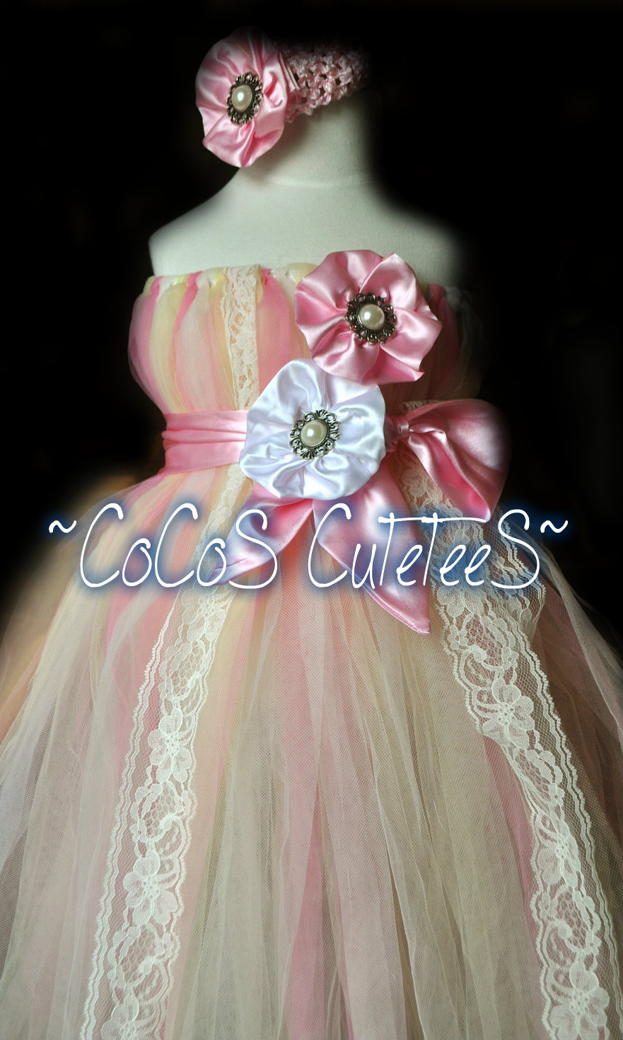 This dainty and elegant tutu dress is made with 150-200 yards of beautiful mixed shades of cream, white, pink tulle and adorned with details of lace throughout. It has a pink satin empire waist with gorgeous white and pink vintage style flowers. It is paired with a matching flower headband to complete the full look.